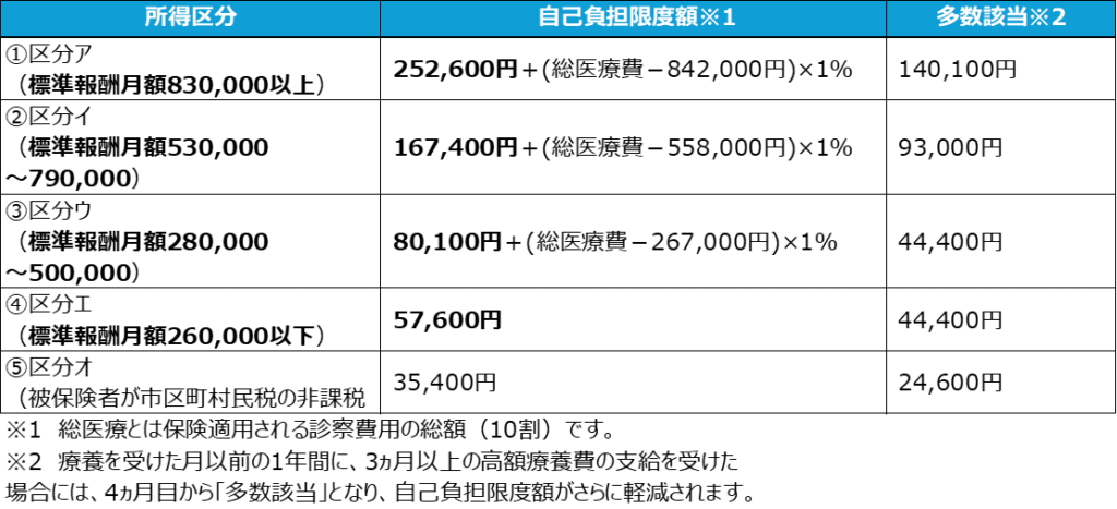 この「自己負担限度」は、その人の年齢と標準報酬月額によって変わります。