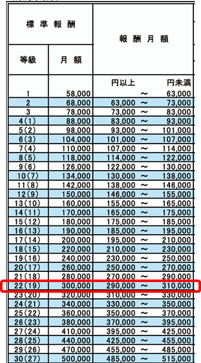 例えば月給の総支給額が295,000円であれば、標準報酬月額は300,000となり、この数字で保険料や給付が決まることになります。