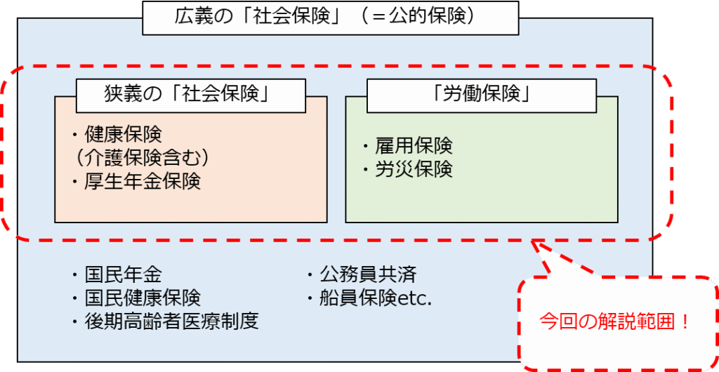 「社会保険」とは何を指すかは、そのことばを使う場面で少し変わります。すなわち「広義(広い意味)の社会保険」を指すか、「狭義の社会保険」を指すかによって意味が変わります。