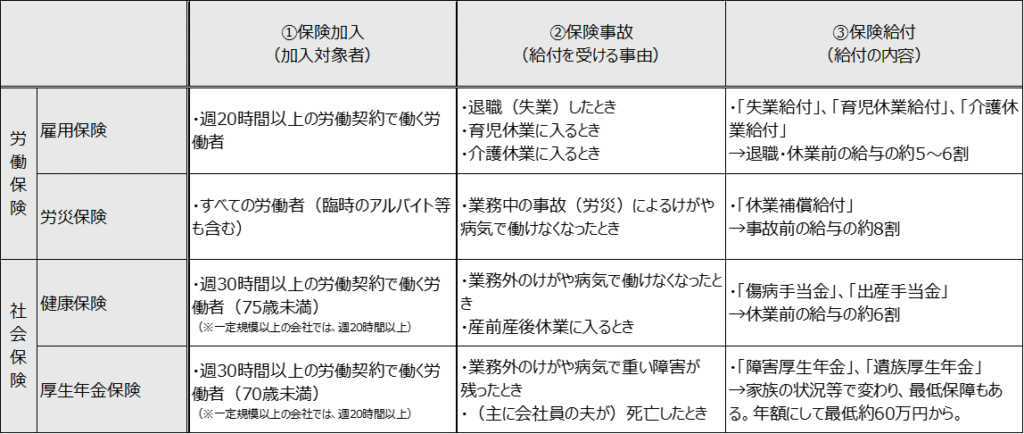 会社員が給与を受け取れなくなる、というのはどのような場面が想定されるでしょうか。私生活での病気で入院、あるいは労災事故でけがをした、などが考えられます。表の②に保険事故として記載しましたが、各法律で「こういう事情で働けなくなった(給与が無くなった)場合」という保険事故が定められているのです。