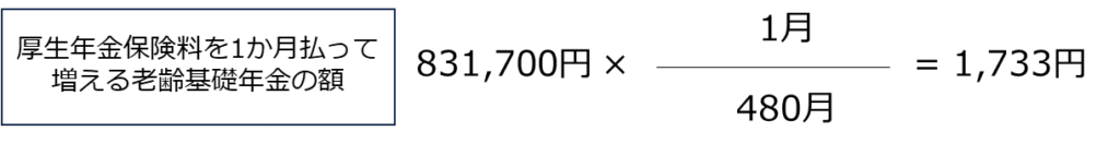 まず、厚生年金を1か月払うと老齢基礎年金がいくら増えるか、というのが以下の式で算出された1,733円/年額です。