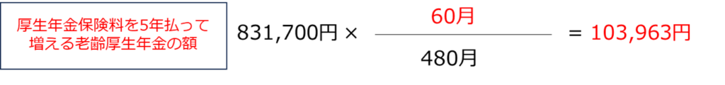 以上から、1か月あたりの1,733円に5年=60月をかけて、5年間厚生年金を払った場合の基礎年金は103,963円/年となります。計算式は下記のとおりです。