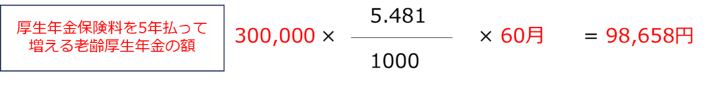 以上の数字をあてはめると、月収30万円で5年間加入した場合の老齢厚生年金は98,658円/年となります。計算式は下記のとおりです。