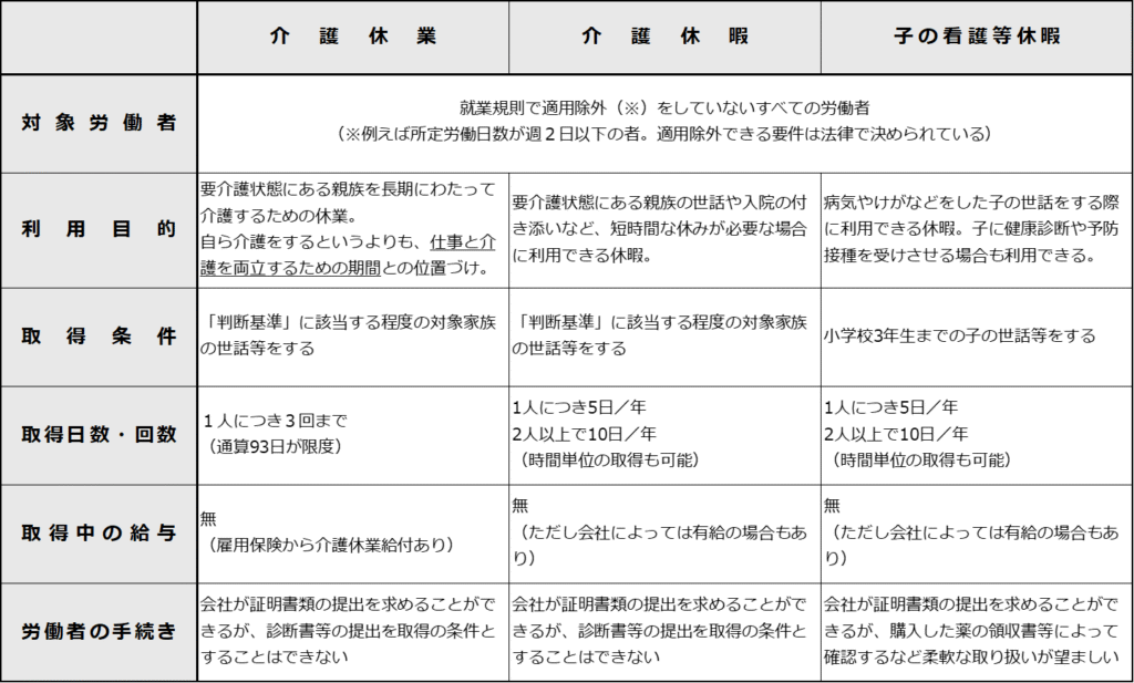 これらの制度はいずれも、仕事と介護や子育ての両立を支援するための制度です。労働者がこれらを利用する際の手続き上のポイントは、制度利用をしやすくすることです。いずれも取得目的が介護などに限定された制度であるものの、休暇等を取らせるにあたって必要以上に証拠書類の提出を求めることはできません。